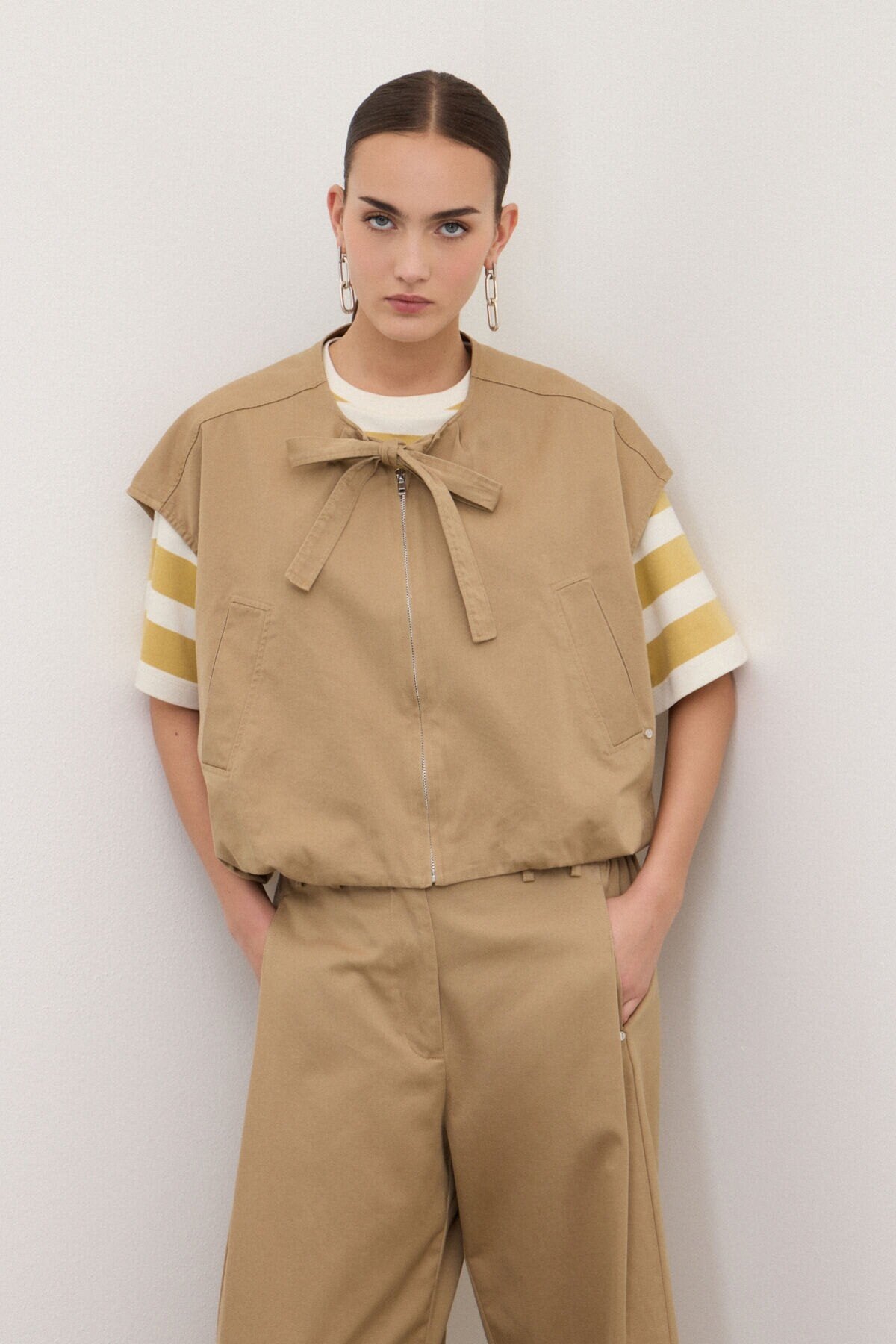 Gilet a palloncino realizzato in 100% gabardina di cotone. La silhouette volumetrica è bilanciata dalla chiusura frontale con zip, mentre il fiocco aggiunge un dettaglio femminile e grafico.