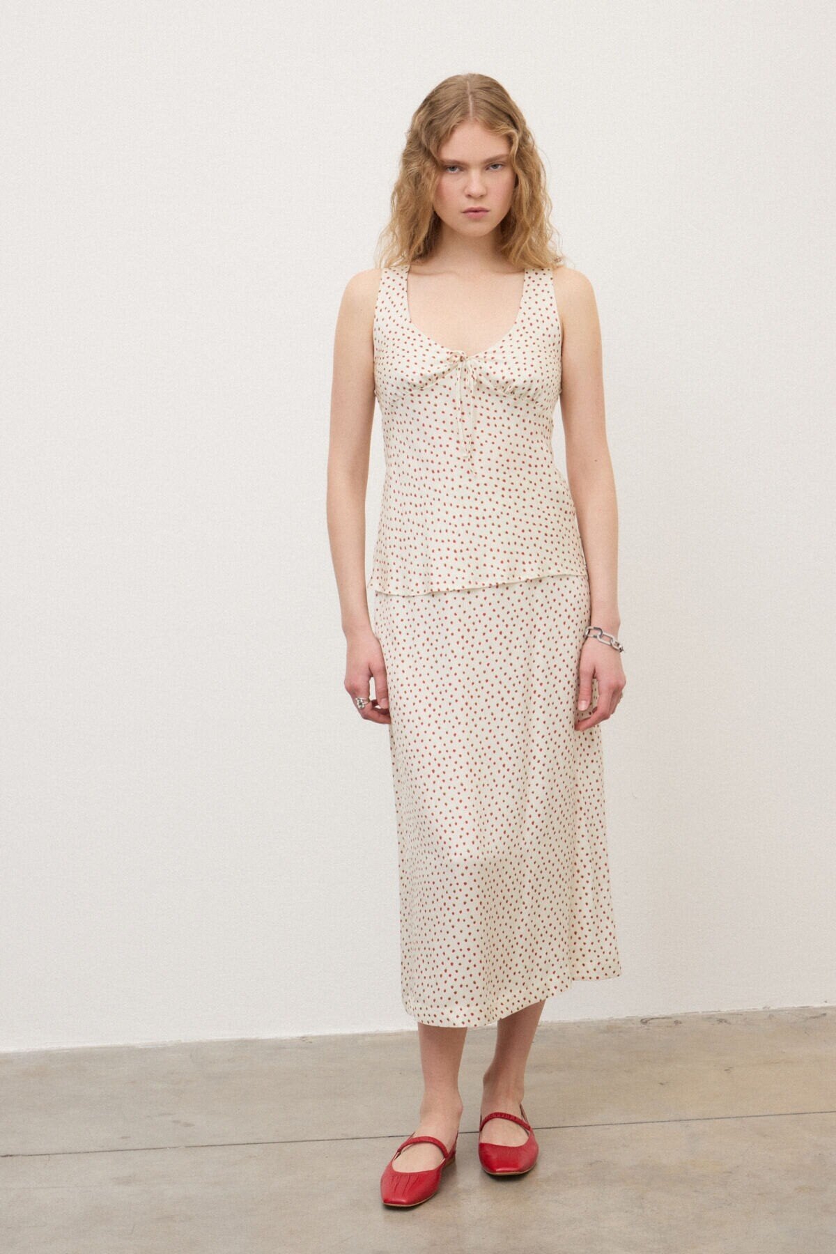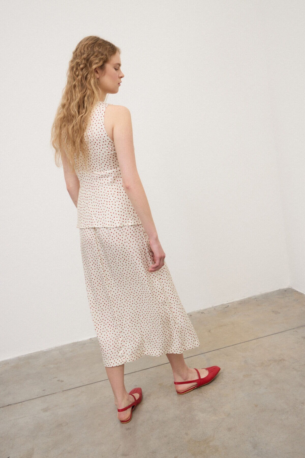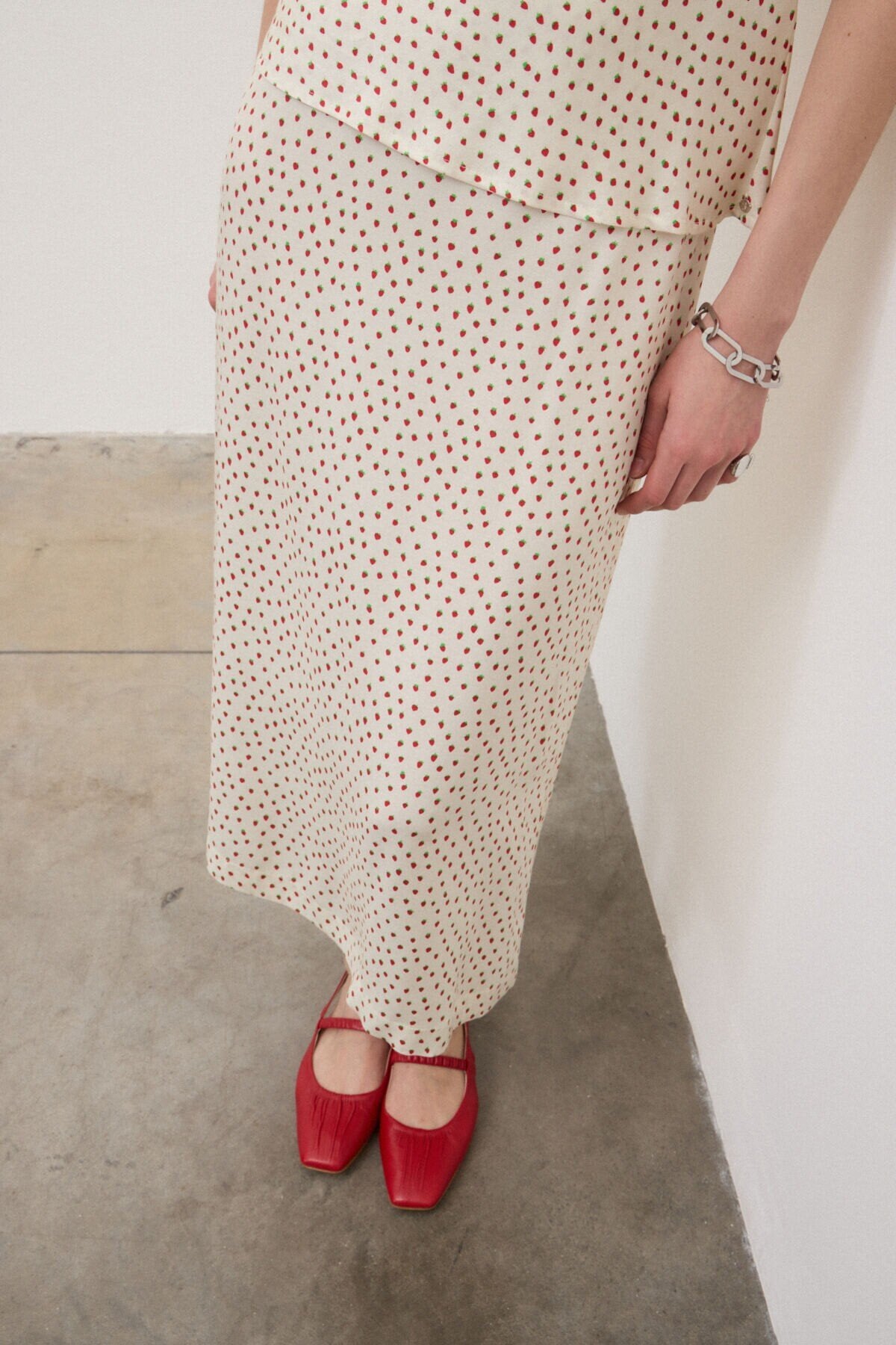 Gonna midi in twill 100% viscosa, caratterizzata da una linea svasata ad A che accompagna il movimento con leggerezza. Il micro disegno di fragoline aggiunge un dettaglio grafico delicato, mantenendo un’estetica essenziale e versatile. Il cinturino presenta un elastico sul retro, pensato per offrire maggiore comfort.
