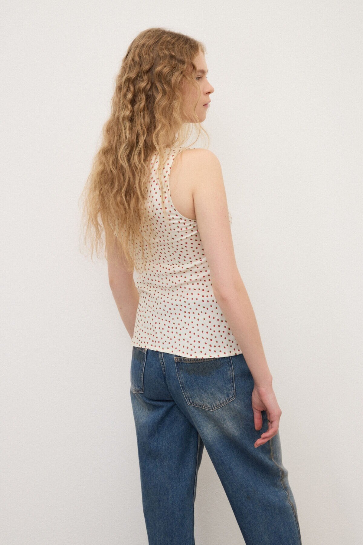 Top in twill 100% viscosa, caratterizzato da una mano leggera e fluida. Lo scollo a V è arricchito da un delicato motivo a piccole pieghe che accompagna la linea del capo, mentre il micro disegno di fragoline definisce la superficie del tessuto con un accento grafico discreto. Pensato per essere indossato sia da solo sia in coordinato, è un capo versatile che completa con naturalezza look quotidiani.